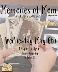 Just in time for Mother’s Day, join me for a fun evening of capturing memories of our mothers or grandmothers on the page! We’ll use prompts and exercises to shape slices of the past into very short memoir pieces. Whether you write daily or are a brave new writer, this workshop will help you focus on vivid details that bring the past to life. Leave with a first draft of a short piece that you can polish and give to a family member or keep for yourself.